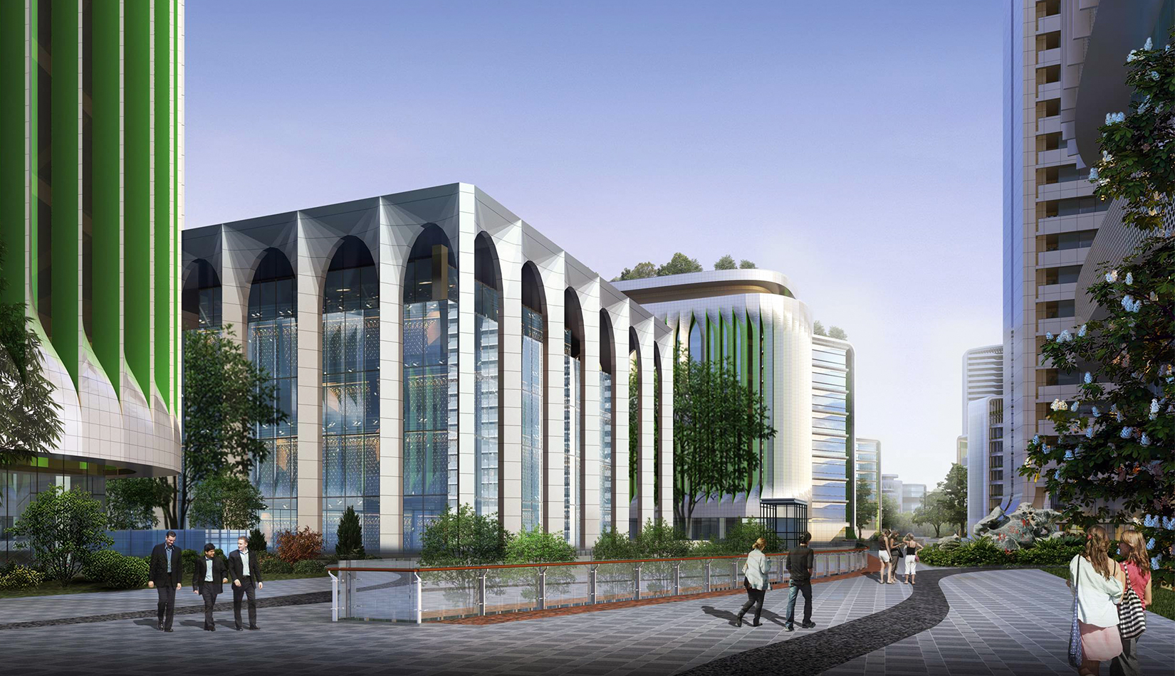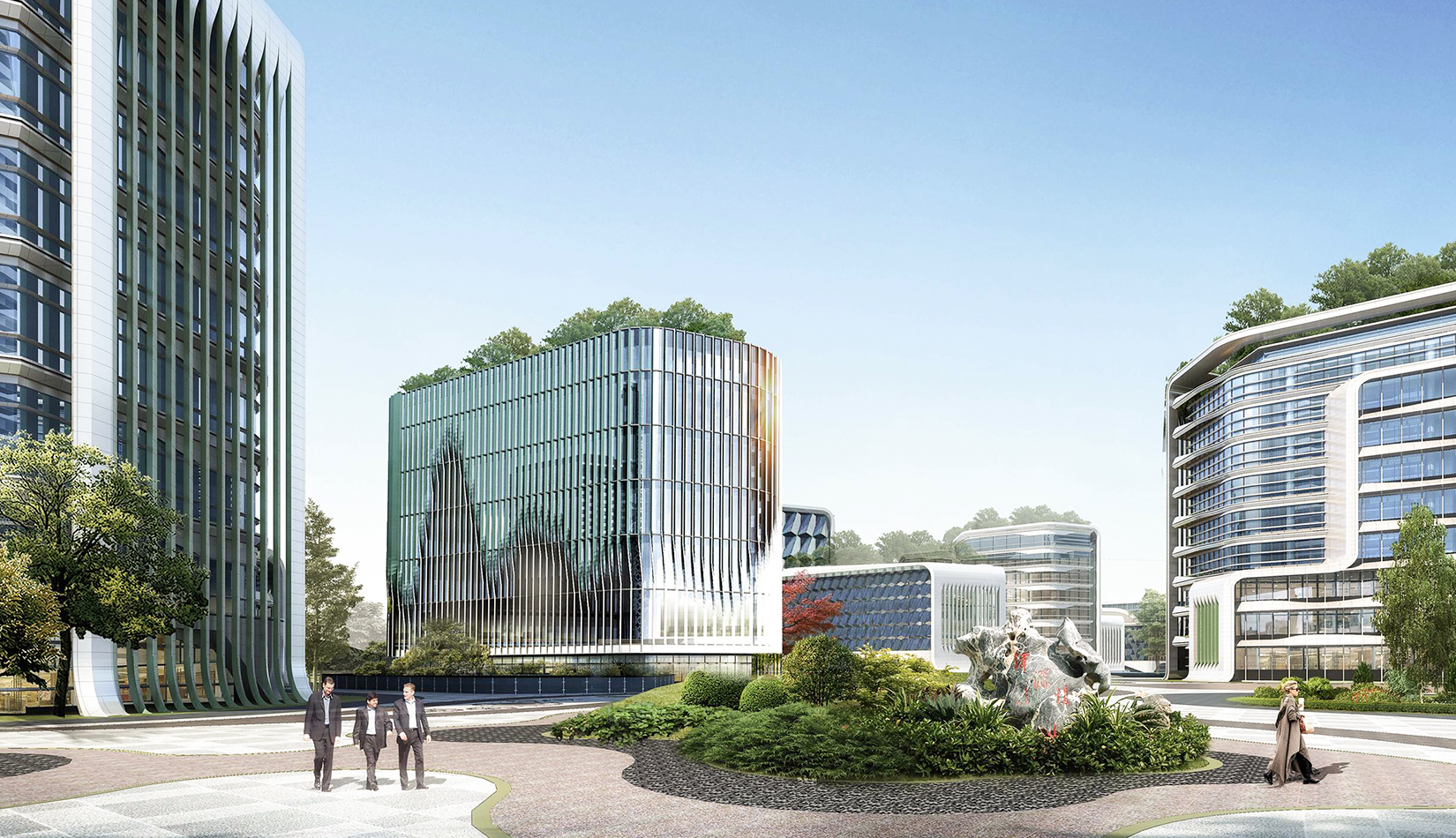 規(guī)劃設計以“曲水流觴”為理念,空間布局取“曲水流觴”場景精髓,以曲徑通幽的景觀系統作為主軸,以組團布局的院士樓為節(jié)點,完成整個園區(qū)的規(guī)劃設計。布局貫穿南北的云游步道,曲徑通幽,步移景異,人在步道上行走,猶如流動的羽觴杯,尋訪院士樓、穿行重重竹林、覓河濱綠地等景致,體會古代曲水流觴之儒風雅俗。