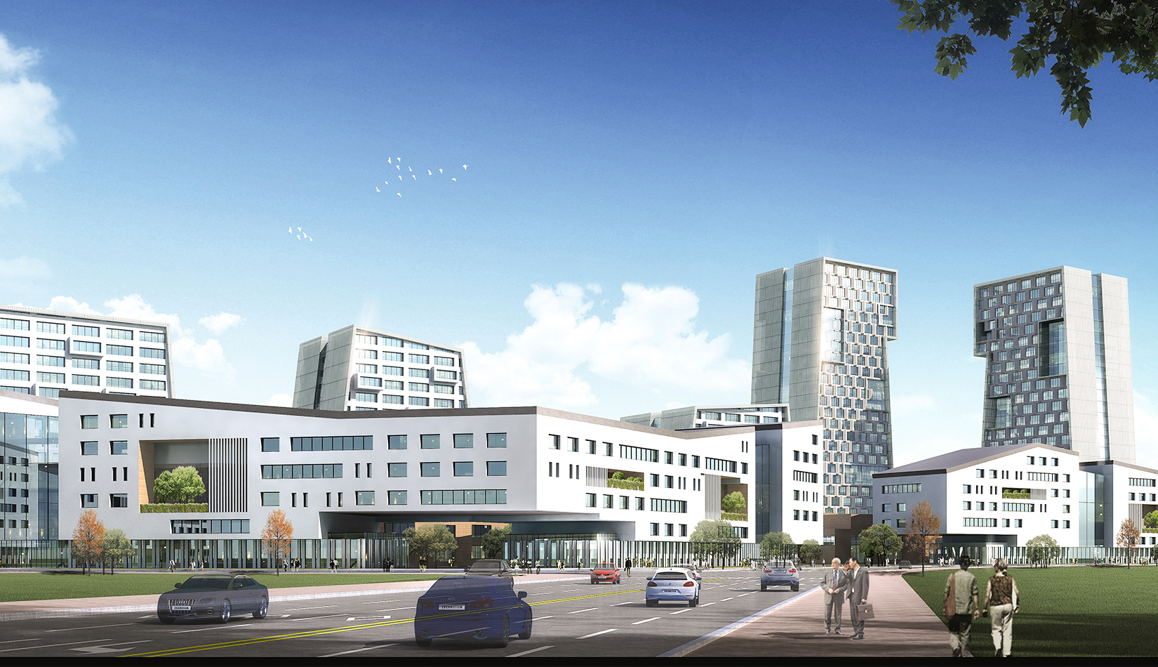 為了打造一個完美的城市沿街形象,以及營造一個安靜舒適的工作與休閑空間,我們采用了半圍合的規(guī)劃布局,北側高層建筑基本成“一”字布局,高低錯落,塑造完美的城市天際線,宛如一條盤旋上升的巨龍;在南側一個個長方形建筑成折線型連續(xù)排列,隔離周邊嘈雜的城市環(huán)境,猶如越出水面的“金鱗”,中央景觀帶東西側以友好的姿態(tài)向城市開放,美化城市形象。\