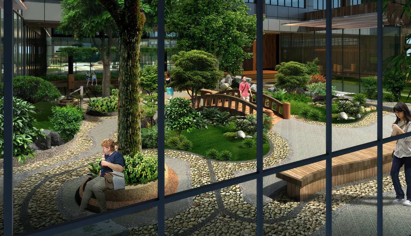 2. 綜合服務(wù)樓中心設(shè)計(jì)特色水景一處,潺潺的流水聲,增加整個(gè)入口空間的活潑歡快的氣氛。
