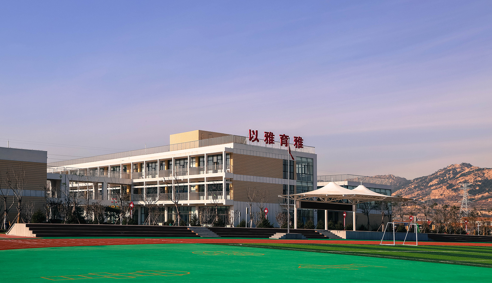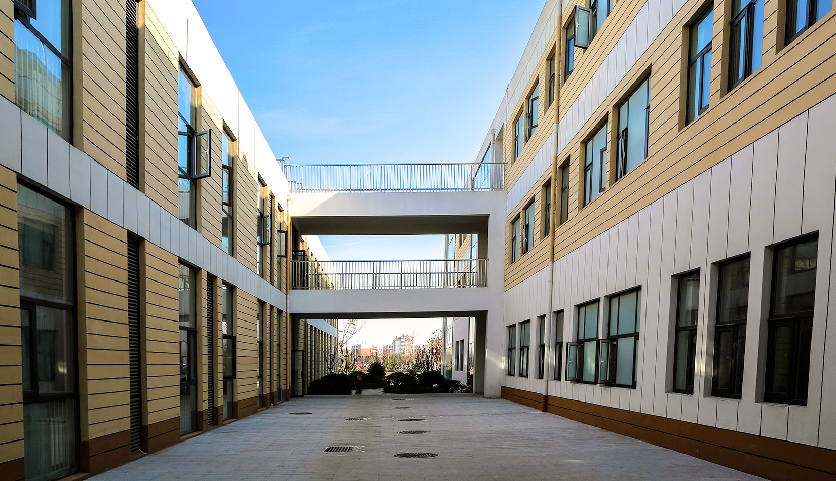 該項目通過幾個建筑單體與架空走廊的穿插連接將整個校區(qū)有機聯系起來,實現了建筑功能的整體性,完善了建筑可達性。形成的中庭空間可成為交流為主的平臺,營造了學習、活動為一體的校園氛圍。建筑外立面以簡潔的現代風格為主,同時表現校園文化,主要采用黃色與白色真石漆形成色彩對比,在教室南立面、樓梯間、就餐區(qū)等采用整體通透的玻璃幕墻與實墻形成虛實對比,形成簡潔而不失活潑的建筑風格。利用借景等手法進行室外綠化設計,整體打造一個高品質的學校環(huán)境。