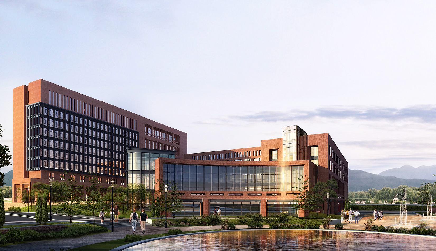 總體的規(guī)劃布局圍繞中心景觀廣場展開設(shè)計。首先從山區(qū)建筑布局師法自然,藏風(fēng)聚氣的傳統(tǒng)觀念出發(fā),結(jié)合現(xiàn)代科學(xué)嚴(yán)謹(jǐn)求真務(wù)實的態(tài)度,設(shè)計以東側(cè)入口廣場導(dǎo)入的中心景觀空間圍合展開規(guī)劃布局,總體上根據(jù)土地的使用性質(zhì)分為四個區(qū),分別是正對主入口北側(cè)的生活區(qū),南側(cè)的孵化中心區(qū),正對主入口廣場的科研辦公區(qū),以及整個用地最南端的產(chǎn)業(yè)開發(fā)區(qū),各個區(qū)既相互獨立同時又緊密聯(lián)系,功能上即考慮主導(dǎo)風(fēng)向又方便使用。