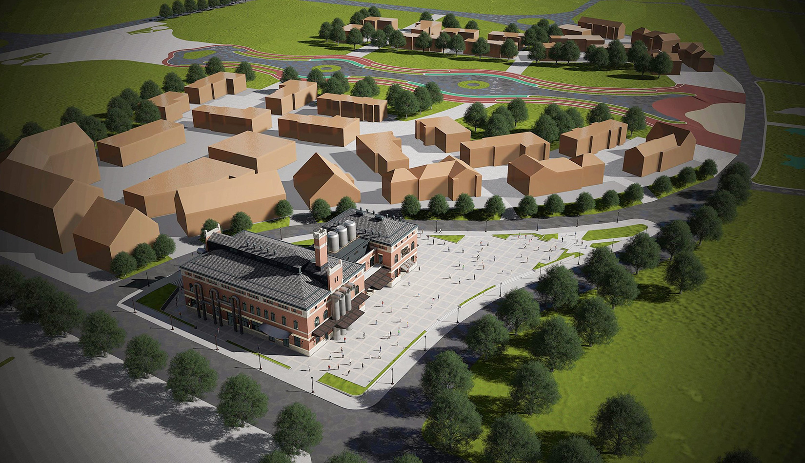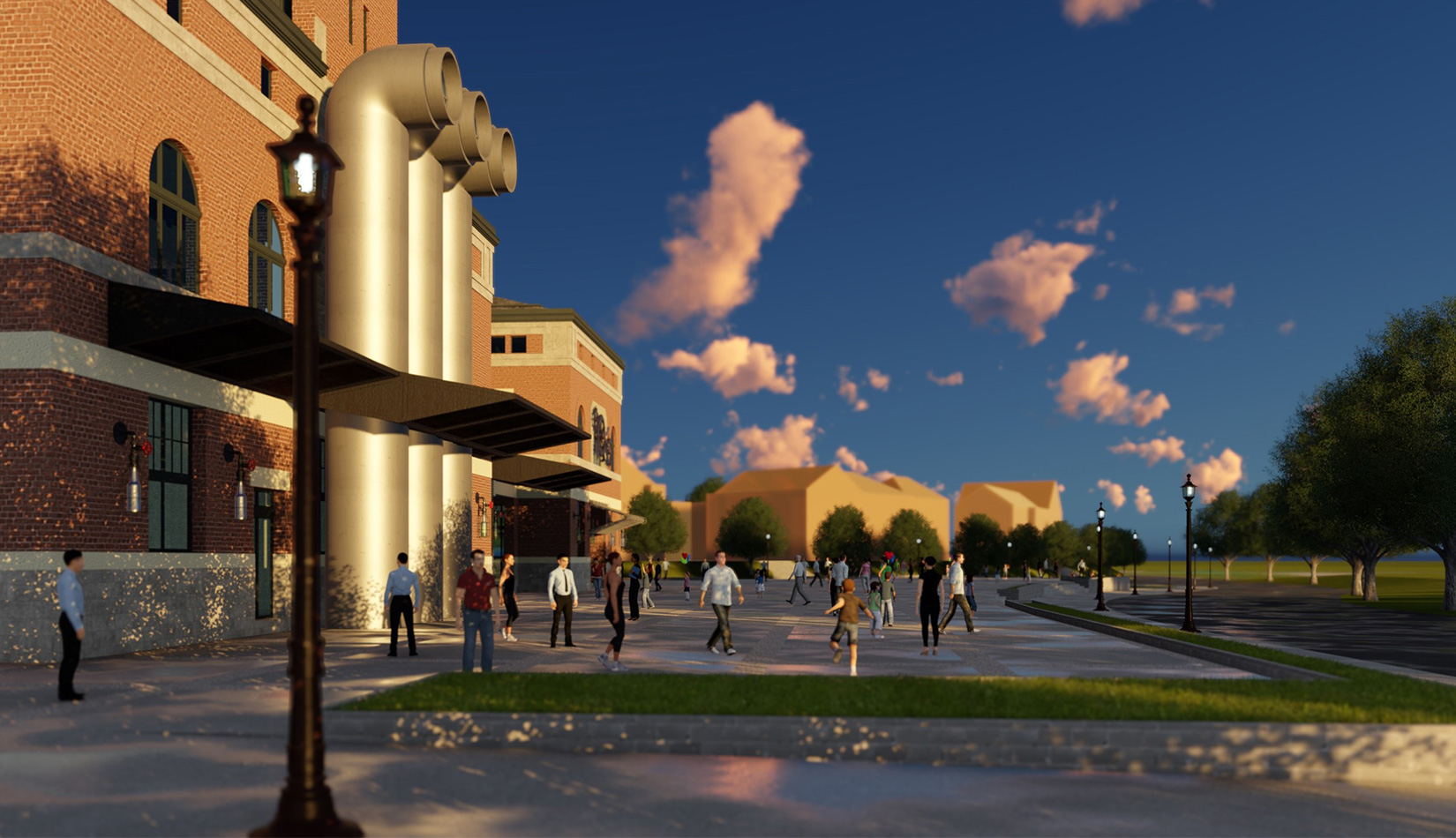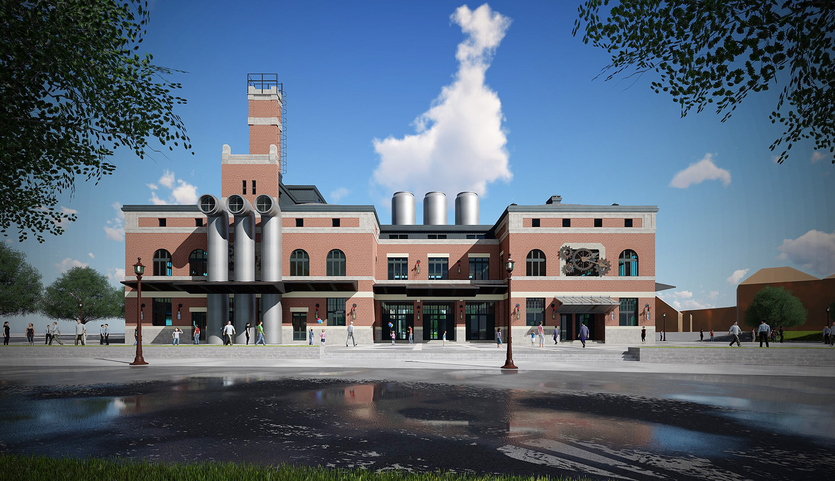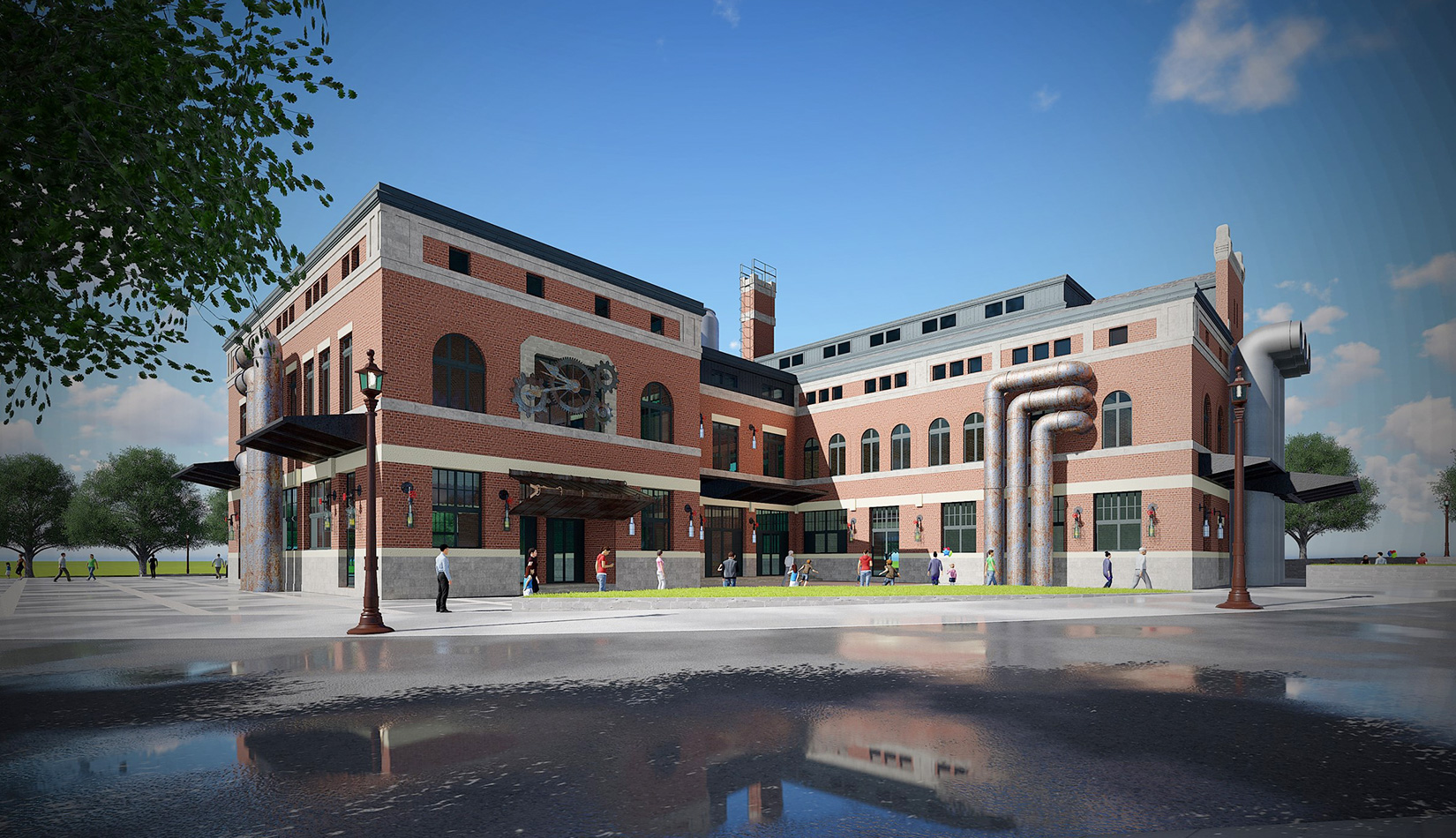 紅磚是工業(yè)風的最佳表現(xiàn)元素之一,本案選取紅磚作為立面主要材質,加以真石漆、石材進行點綴,磚塊與磚塊中的縫隙可以呈現(xiàn)有別于一般墻面的光影層次。屋面形式選取深灰色瓦屋面加以深色金屬板點綴,與立面形成強烈的視覺對比,旨在體現(xiàn)工業(yè)風的粗獷氛圍。