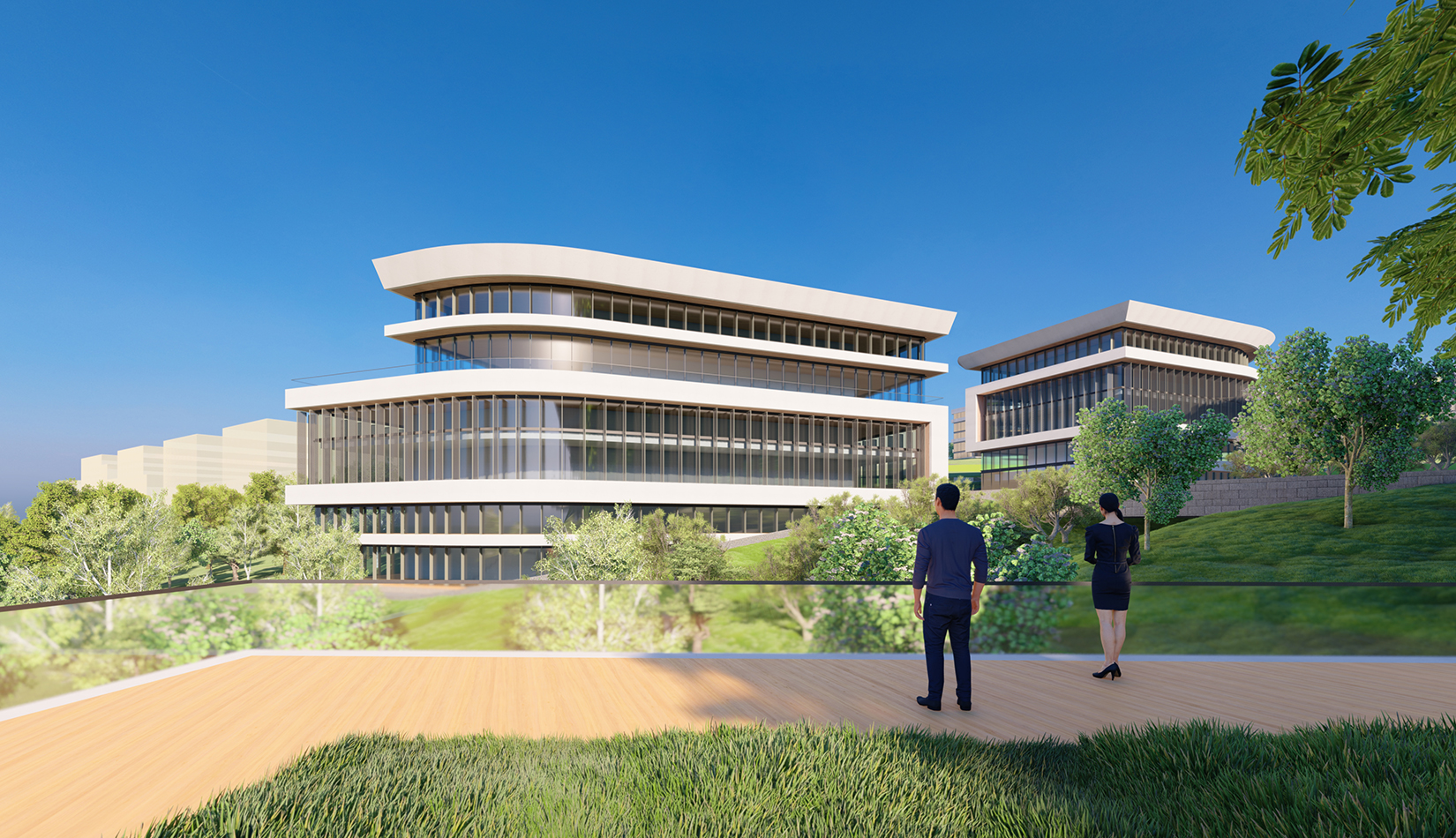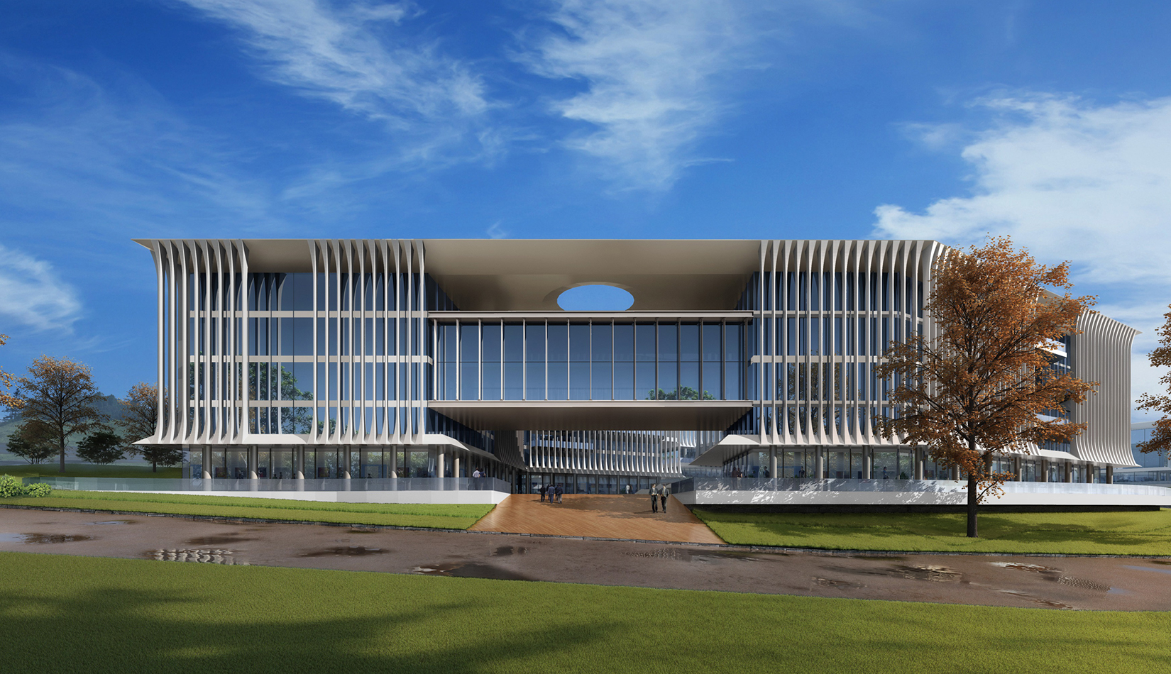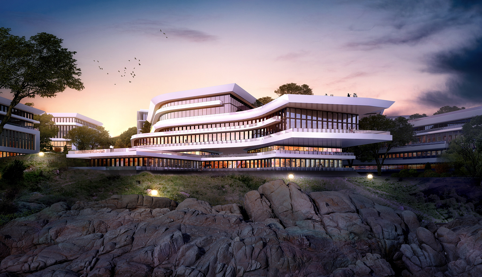 簡(jiǎn)潔大氣的豎向橫向劃分,使MECS主樓充滿(mǎn)海洋氣息;白色流線(xiàn)型屋頂順應(yīng)地勢(shì),自由舒展。流線(xiàn)型的體塊靠近海岸線(xiàn),表達(dá)科研人員的探索精神,并且與地勢(shì)相結(jié)合。