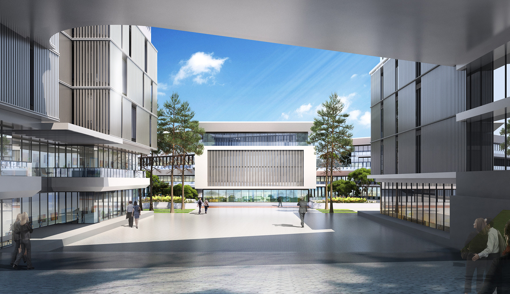 建筑立面采用疏密有致的格柵化立面,凸顯了預(yù)警基地的嚴(yán)肅性;白色流線(xiàn)型屋頂順應(yīng)地勢(shì),給建筑賦予現(xiàn)代的海洋氣息。不同的建筑功能合理布局,沿海建筑采用退臺(tái)的建筑手法,沿海岸線(xiàn)立面生動(dòng)活潑。