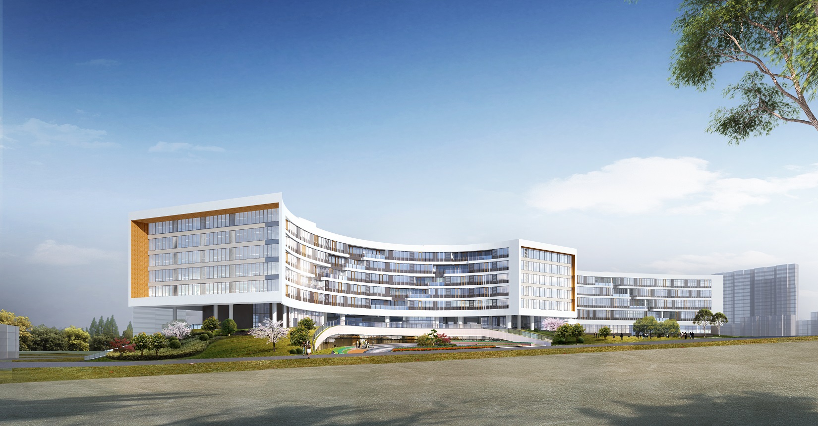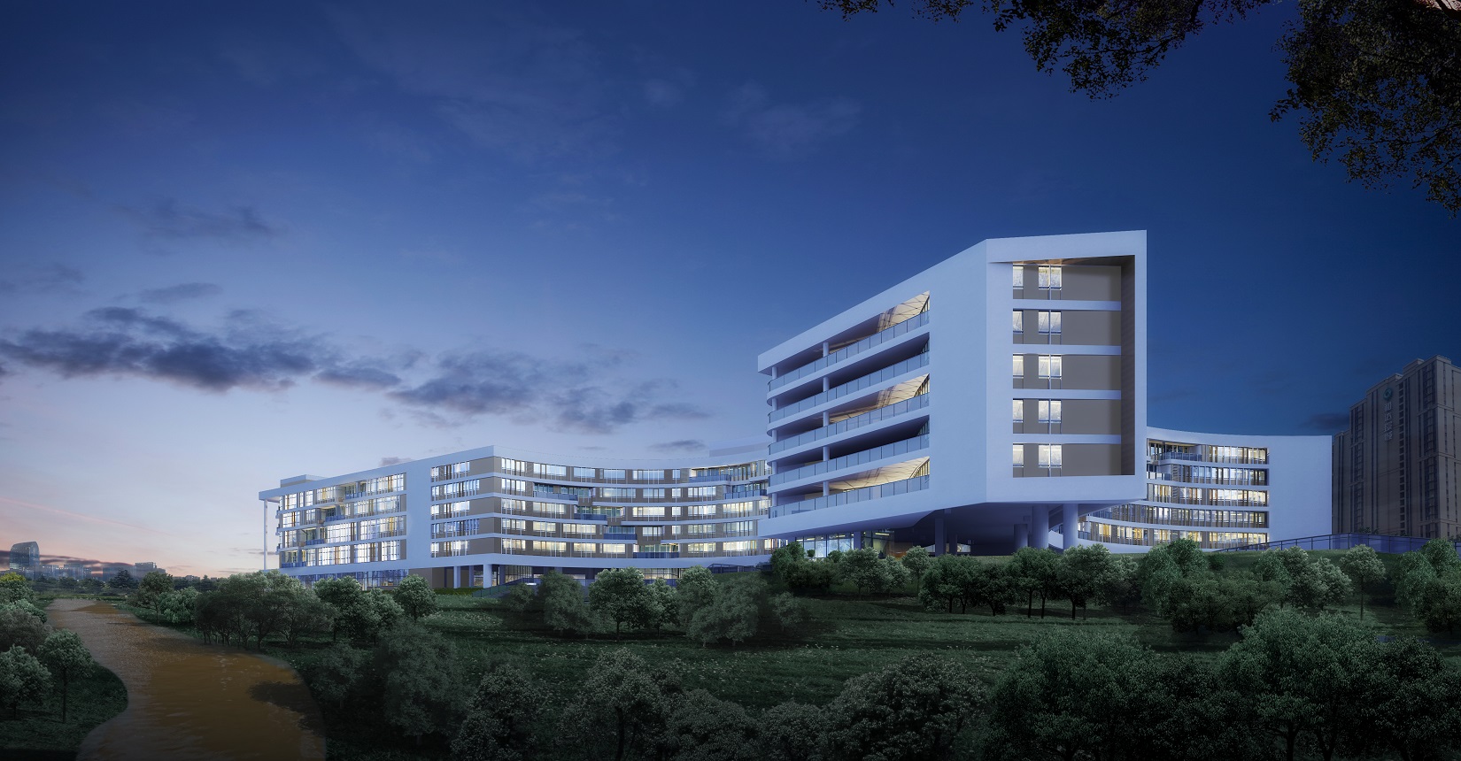 考慮到用地形狀、使用功能和日照等條件因素的影響,總平面布局以“生長”為主題,寓意生命向上生長的力量,生生不息,無限伸展。枝杈無限分支向上生長,象征著無限的力量與生機。而中醫(yī)的健康講究氣血通暢,循環(huán)往復(fù),從而衍生出“五行”相輔相成的設(shè)計理念。根據(jù)五行方位確定五行主題。將金水湖與建筑相融合,金水湖為“水”,輔“金”“木”“火”“土”四個主題廣場。
