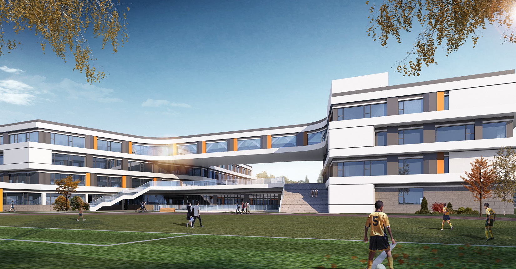 項(xiàng)目設(shè)計(jì)以“書籍”和“階梯”為靈感,將教學(xué)樓以退臺(tái)及錯(cuò)落的形式展示“書籍”和“階梯”的理念,設(shè)計(jì)現(xiàn)代化“書本”校園,希望學(xué)生們?cè)谧x書中成長(zhǎng)。